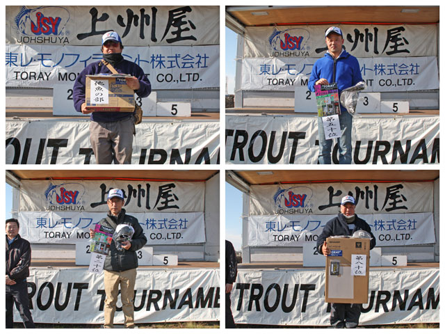 また、今大会では鬼怒川フィッシングエリアの協力を得て、タグ付きトラウトを放流。釣り上げた方に特別賞を進呈しました。大会終了後も、この残ったタグ付きトラウトを釣上げた方には上州屋&東レより賞品(※)を差し上げております!見事タグ付きトラウトを釣られた方は、魚にタグが付いた状態で鬼怒川フィッシングエリア事務所までお持ちください。