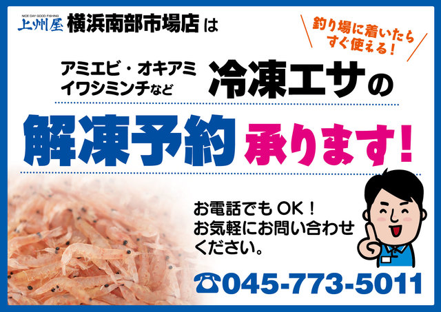 横浜南部市場店では、アミエビ・オキアミ・いわしミンチなど冷凍エサの解凍予約も承っております!お電話でもOK!お気軽にお問い合わせ下さい。