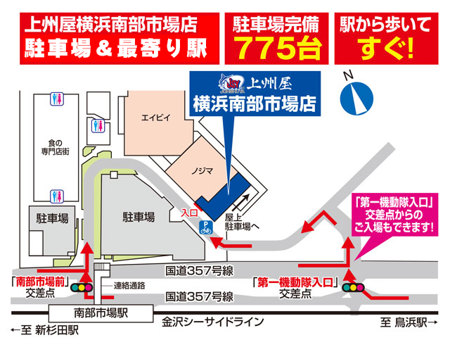 施設駐車場775台!金沢シーサイドライン「南部市場駅」目の前!BASS、ソルトなどルアー用品地域最大級!上州屋横浜南部市場店は抜群の品揃えとアクセスの良さで、皆様のフィッシングライフを徹底応援します!