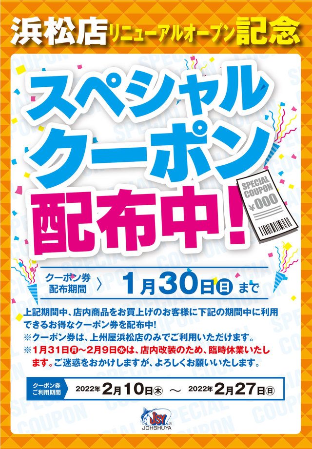 只今、上州屋浜松店にて店内商品お買い上げのお客様に同店リニューアルオープン後(2月10日~27日)にご利用いただけるスペシャルクーポン配布中!