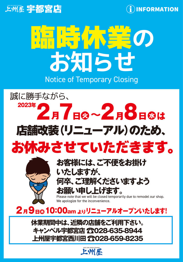 上州屋宇都宮店、店舗改装による2/7(火)~2日間臨時休業および2/9(木)リニューアルオープンのお知らせ。