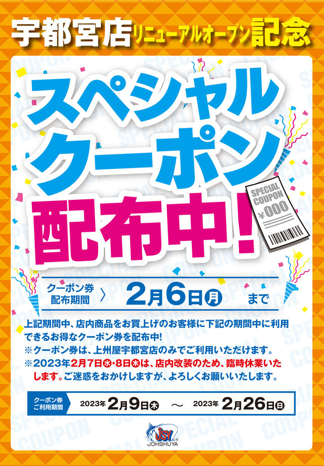只今、上州屋宇都宮店にて店内商品お買い上げのお客様に同店リニューアルオープン後(2023年2月9日~2月26日)にご利用いただけるスペシャルクーポン配布中!