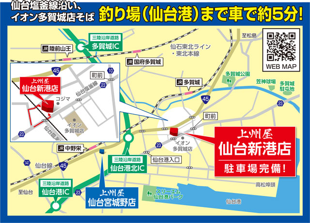 新店舗「上州屋仙台新港店」は塩釜線沿い、イオン多賀城店そば。人気釣り場(仙台港)まで車で約5分!金土祝前日は便利なオールナイト営業!