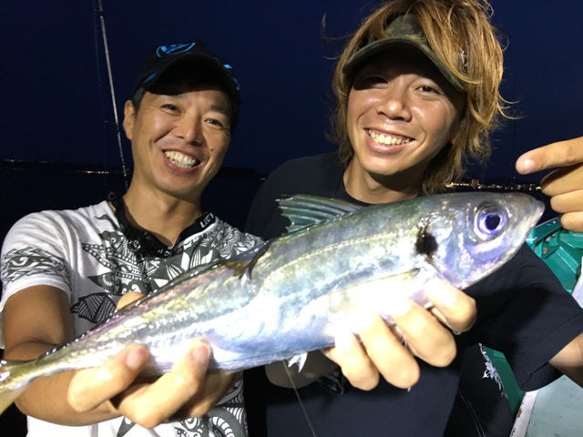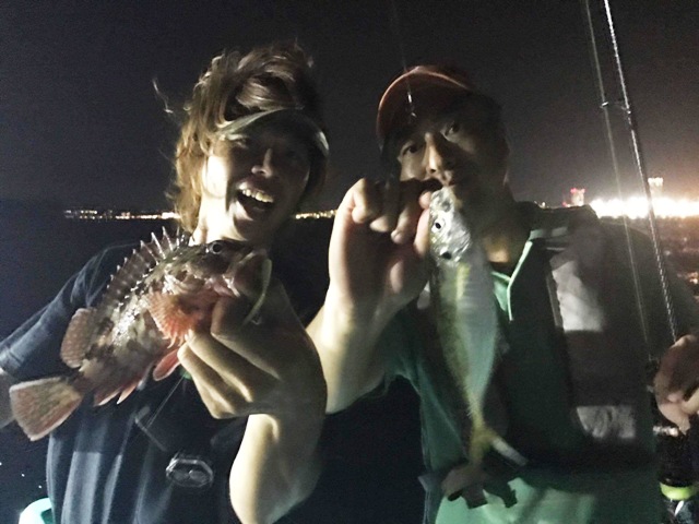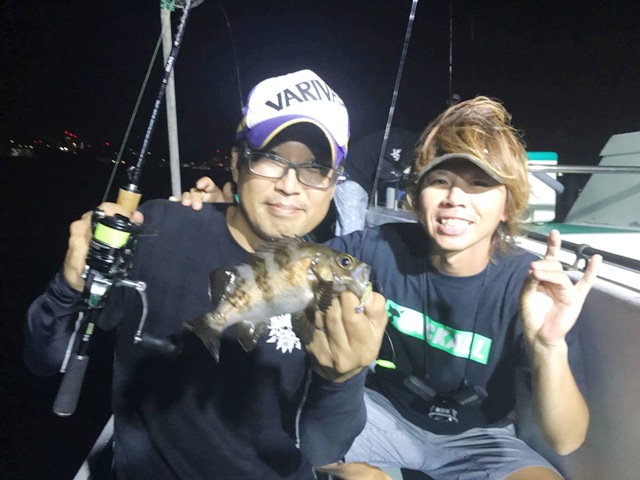 完全に日が落ちて暗くなってからの後半戦、船長がいわゆる夜メバル船のポイントを流してくれました。すると、メバル、カサゴなどロックフィッシュ(根魚)の釣果が目だって増え、バチコン釣法がロックフィッシュにも十分に有効であることが確認出来ました!また、単発ながら余裕で尺オーバー37.5cmの良型アジも顔を見せてくれました!