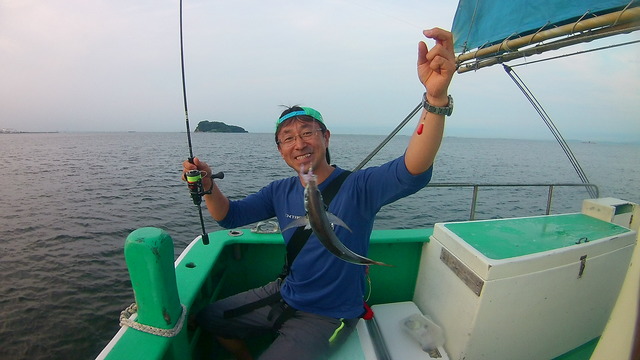 何といきなり釣れてしまいました!出船前のレクチャータイム、船上でJACKALL吉岡プロの指導に従ってリグの動かし方を確認していたらコン!と竿先がもって行かれてご覧のとおり。何とその後もレクチャー中のロッドが次々と曲がってアジが釣れてしまうという嬉しいハプニングが発生!