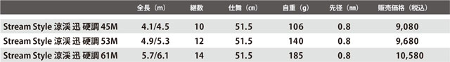 硬調45M(4.1m/4.5m)、硬調53M(4.9m/5.3m)、硬調61M(5.7m/6.1m)をラインナップ。それぞれポイントや状況に合わせて、40cm伸縮できる便利な2WAYマルチレングスです。