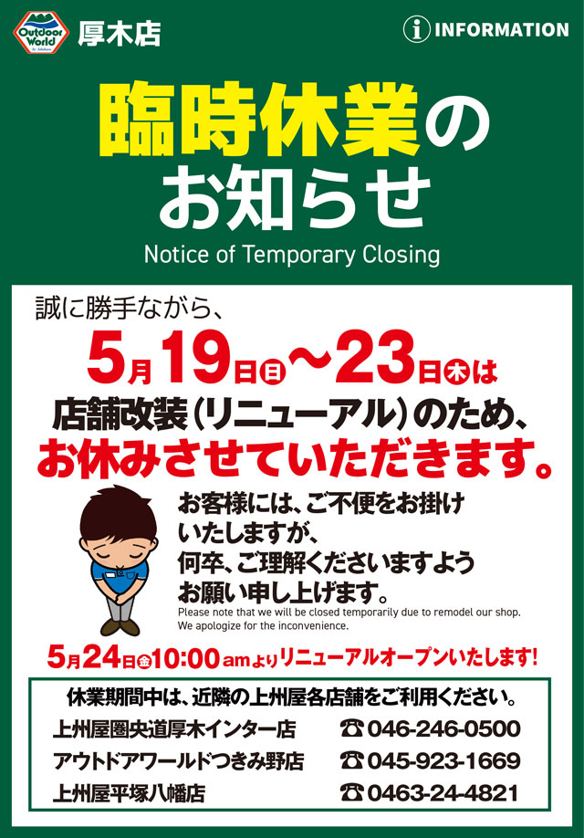 上州屋アウトドアワールド厚木店、店舗改装による5/19(日)~5日間臨時休業および5/24(金)リニューアルオープンのお知らせ。