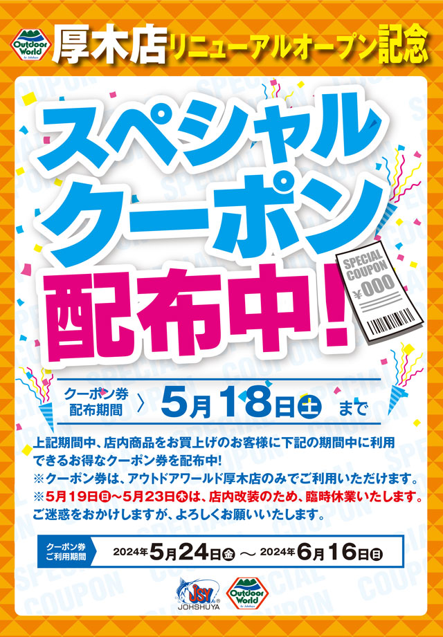 只今、上州屋アウトドアワールド厚木店にて店内商品お買い上げのお客様に同店リニューアルオープン後(5月24日~6月16日)にご利用いただけるスペシャルクーポン配布中!