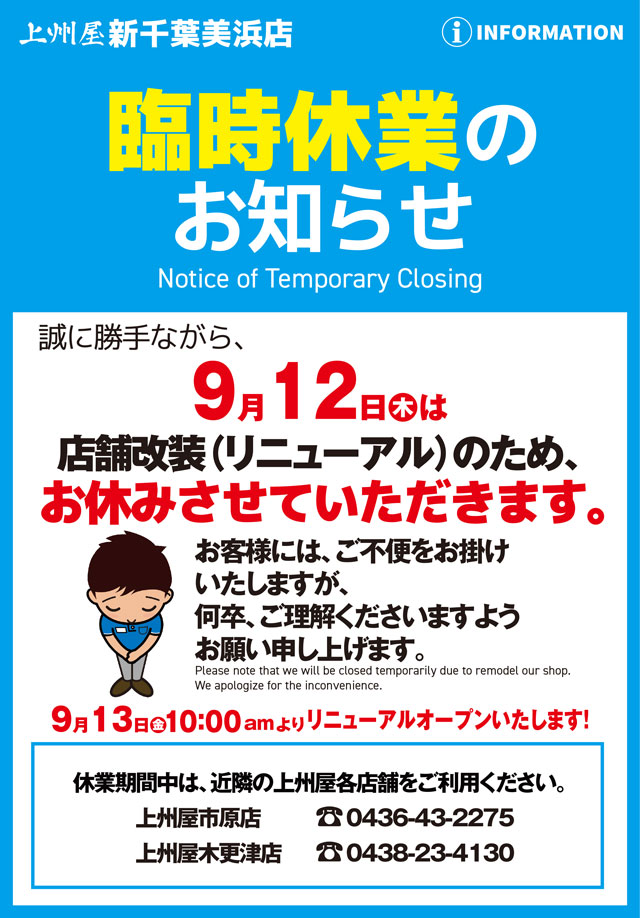 上州屋新千葉美浜店、店舗改装による9/12(木)臨時休業および9/13(金)リニューアルオープンのお知らせ。