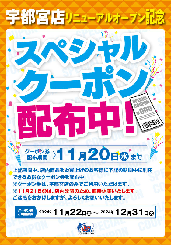 只今、上州屋宇都宮店では店内商品お買い上げのお客様に同店リニューアルオープン後(11月22日~12月31日)にご利用いただけるスペシャルクーポン配布中!