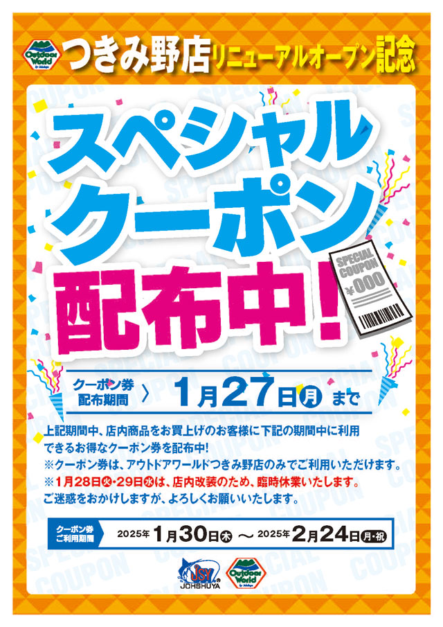 只今、上州屋アウトドアワールドつきみ野店では店内商品お買い上げのお客様に同店リニューアルオープン後(1月30日~2月24日)にご利用いただけるスペシャルクーポン配布中!
