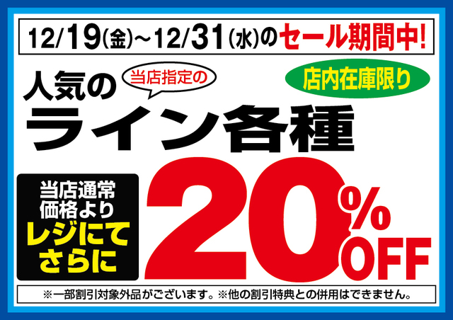 12月19日(金)~31日(水)のセール期間中、当店指定のライン各種が店内在庫限り当店通常価格よりレジにてさらに20%OFF!!