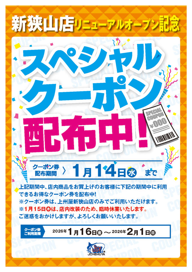 只今、上州屋新狭山店では店内商品お買い上げのお客様に同店リニューアルオープン後(1月16日~2月1日)にご利用いただけるスペシャルクーポン配布中!