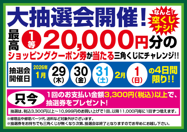 ※抽選券(抽選回数)は税込3,300円以上~10,999円のお買い上げで1枚(1回)、以降11,000円につき1枚(1回)づつ増えます!※修理代金や修理パーツ代、送料などのお支払いは抽選券発行の対象外となります。※開催期間中でも三角くじがなくなり次第、抽選会は終了となります。期間中はお早目のご来店をお願い申し上げます。