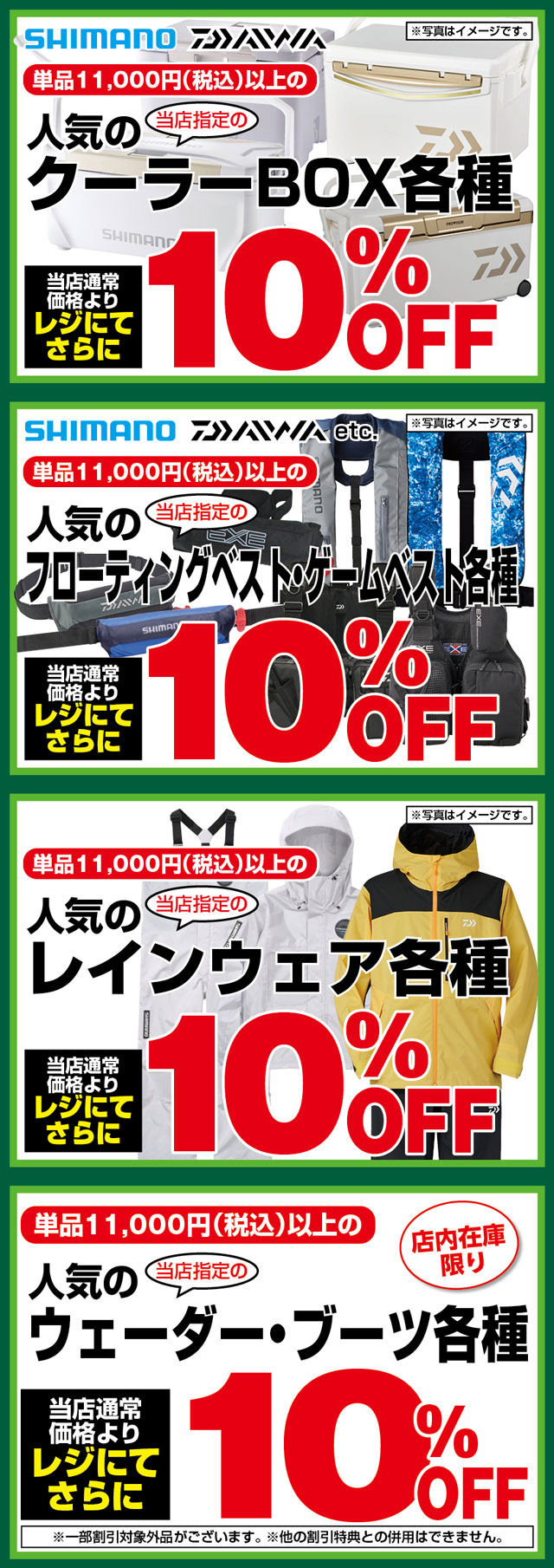 1月23日(金)からのセール期間中、シマノ、DAIWAほか当店指定、単品税込11,000円以上の「クーラーボックス各種」「フローティングベスト・ゲームベスト各種」「レインウェア各種」「ウェーダー・ブーツ各種」が当店通常価格よりレジにてさらに10%OFF!