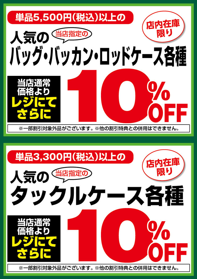 1月23日(金)からのセール期間中、当店指定の単品税込5,500円以上のバッグ・バッカン・ロッドケース各種および当店指定の単品税込3,300円以上のタックルケース各種が、店内在庫限り当店通常価格よりレジにてさらに10%OFF!