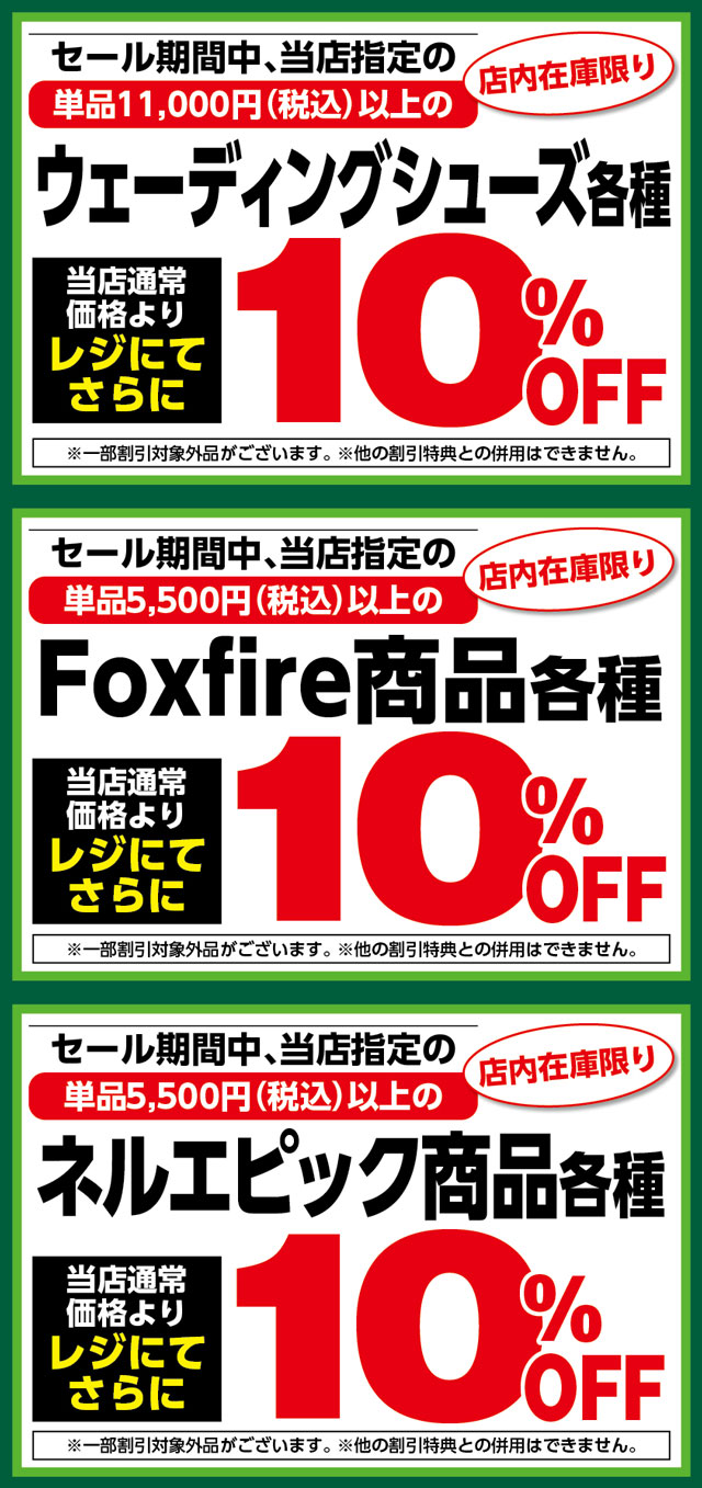 1月23日(金)からのセール期間中、当店指定の単品税込11,000円以上のウェーディングシューズ各種および、当店指定の単品税込5,500円以上のFoxfire商品各種、ネルエピック製品各種が、店内在庫限り当店通常価格よりレジにてさらに10%OFF!