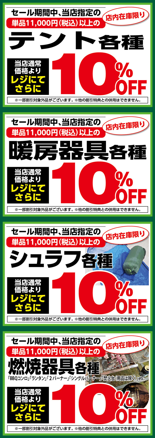 1月23日(金)からのセール期間中、当店指定、単品税込11,000円以上の「テント各種」「暖房器具各種」「シュラフ各種」「BBQコンロ、ランタン、2バーナー、シングルバーナー、焚火台(用品は除く)などの燃焼器具各種」が当店通常価格よりレジにてさらに10%OFF!
