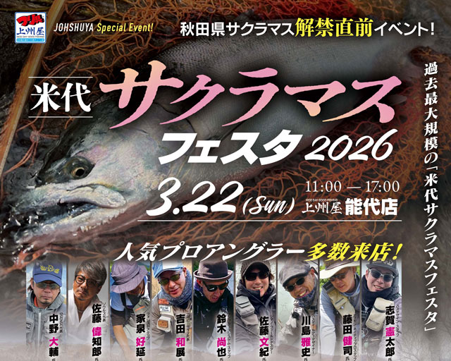 2026年3月22日(日)、上州屋能代店にて秋田サクラマスの解禁直前イベント「米代サクラマスフェスタ2026」を店頭開催!過去最大21社のサクラマス用品&渓流トラウト用品が集結!人気プロスタッフ・テスターも多数来店!