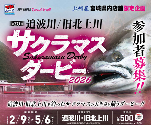 【宮城県】遡上が活発となる2月上旬~GW(ゴールデンウィーク)にかけて例年好評〔宮城5店舗限定〕サクラマスダービーを開催!どうぞ皆様奮ってご参加下さい!