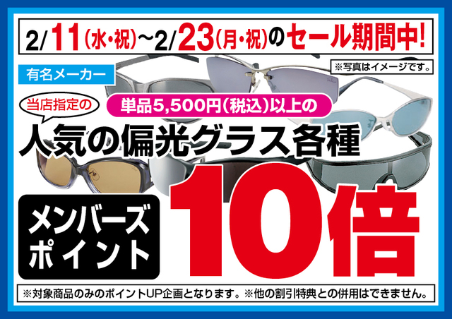〔都内8店限定〕セール期間中、当店指定単品5,500円(税込)以上の偏光グラス各種をお買い上げで、メンバーズポイント10倍