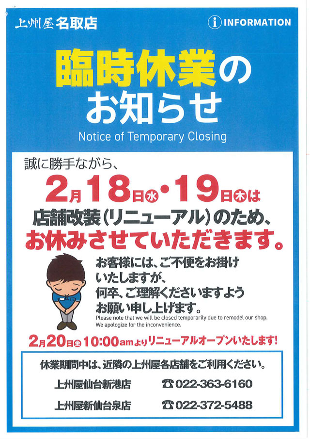 上州屋名取店、店舗改装による2/18(水)~19(木)臨時休業および2/20(金)リニューアルオープンのお知らせ。
