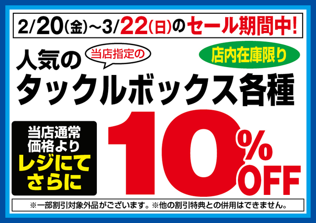 2月20日(金)からのセール期間中、当店指定のタックルボックス各種が当店通常価格よりレジにてさらに10%OFF!