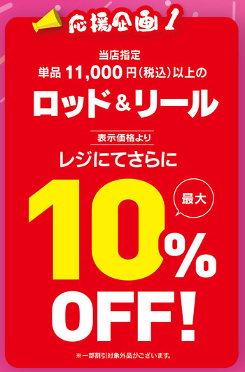 セール期間中、当店指定単品11,000円(税込)以上のロッド&リールが、店内表示価格よりレジにてさらに10%OFF!