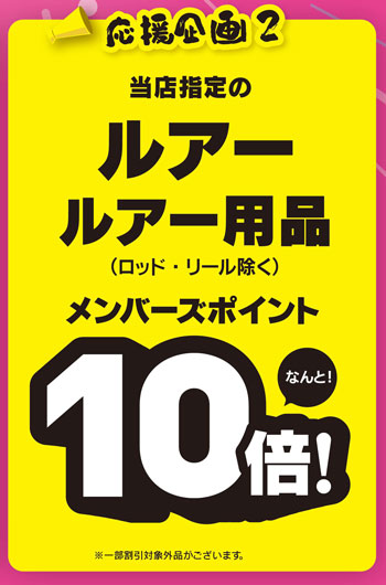 セール期間中、当店指定のルアー・ルアー用品(ロッド・リールは除く)がメンバーズポイント10倍!