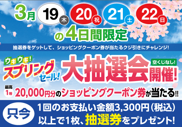 2月26日(木)より店内1回の支払い金額税込3,300円以上お買い上げで、3月19日(木)、20日(金祝)、21日(土)、22日(日)の4日間開催、ウキウキスプリング大抽選会に参加いただける抽選券をプレゼント!最高1等20,000円分のショッピングクーポン券が当たるチャンス!空クジなし!
