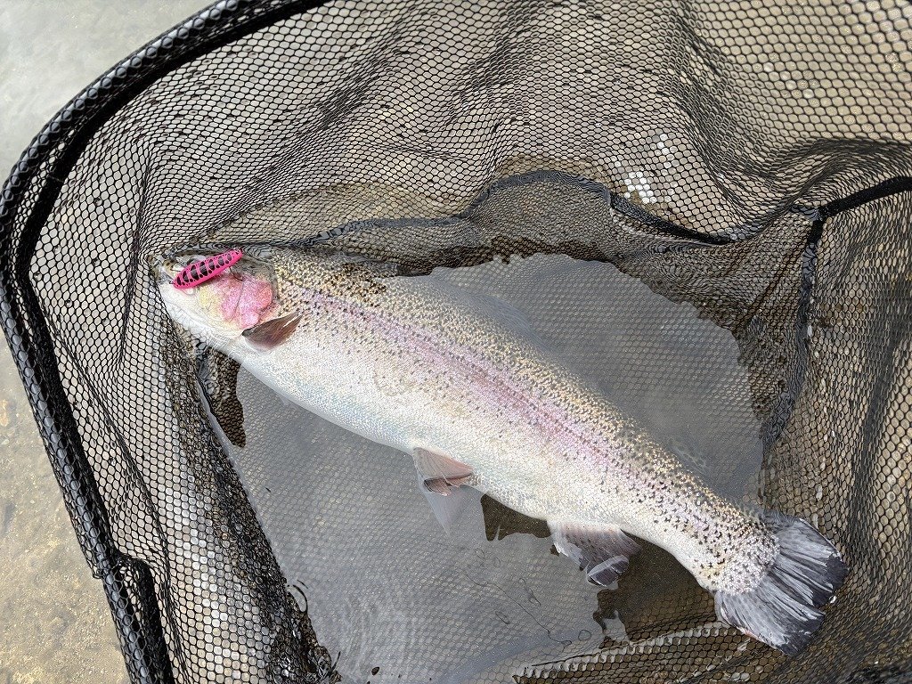 その後も61㎝のニジマスが掛かり、ルアーを丸のみ!