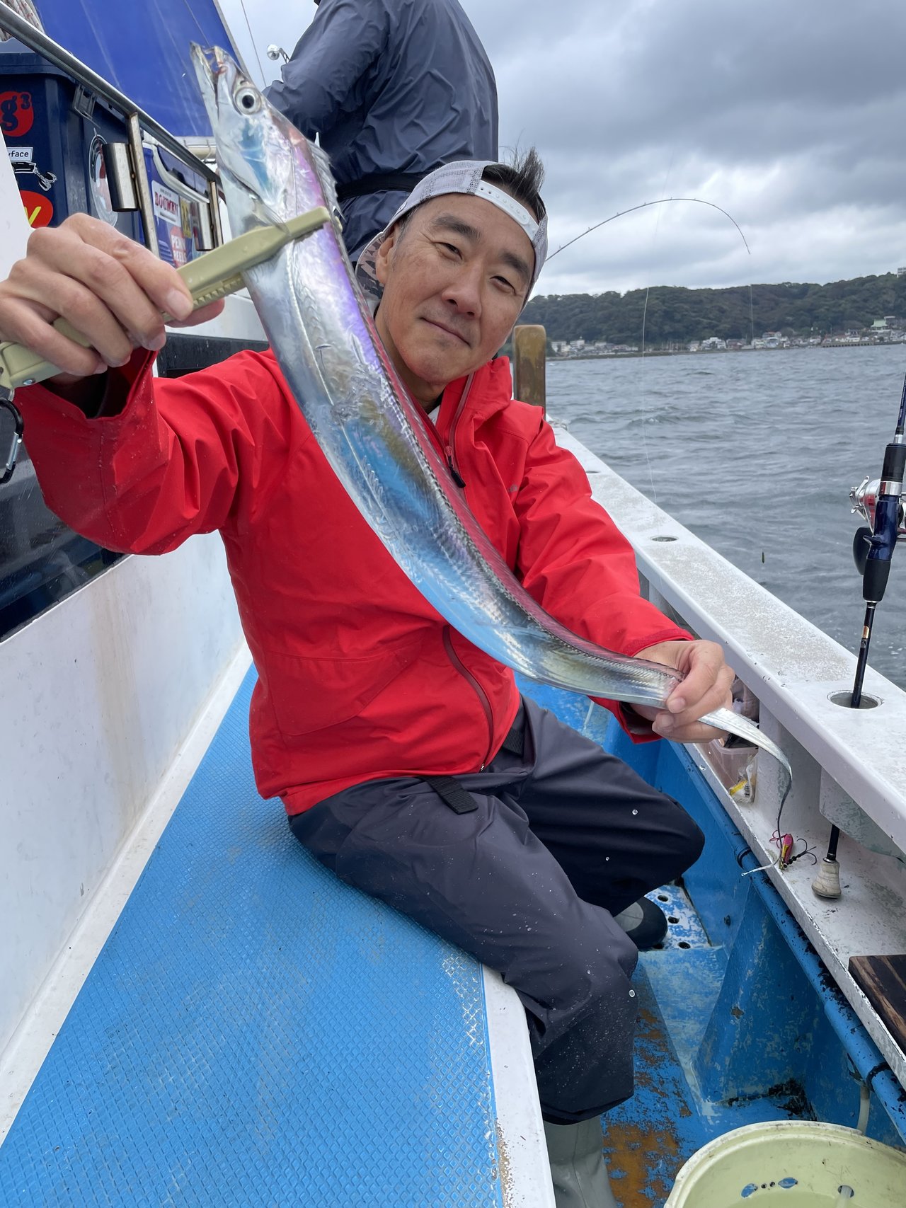 ポイントは走水沖の水深70m前後。北風強風&冷たい雨でタフコンデションながらも朝イチは反応もバッチリ!海底から10mほど持ち上がっており、天候とは裏腹にタチウオは活発な食いっぷり!