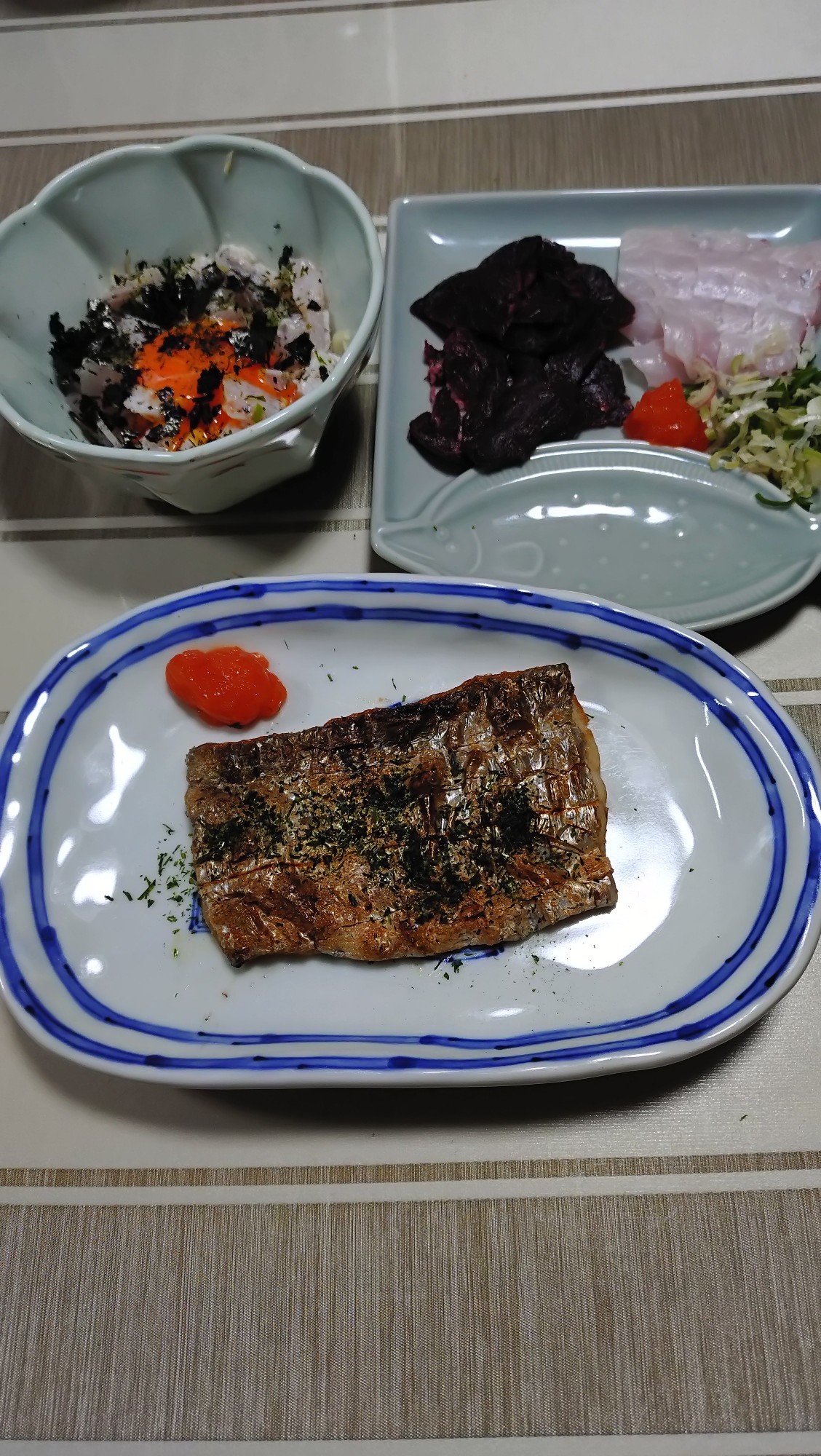 今期2回目の磯釣り釣行…2日目…南伊豆須崎沖磯へ、渡礁して潮の流れを見ると程よく磯際をかすめるいい感じの釣れそうな流れ、0ウキにノーガンで攻めるも上潮にウキが飛ばされている感じなので00ウキにチェンジしてストッパーの下へガン玉G5を1個付けるとウキのシモリ具合がベスト?な状態になり、寄せ餌と付けエサ(ウキ)のシモリ具合が同調すると中型のメジナ・イサキからダイレクトなライン引きのアタリが多数で磯竿を目一杯まげてのやり取りで昨日の鬱憤を晴らします。棚を下げすぎると歓迎しない他魚が多いので当日は竿1本前後をメインで攻めました。その後はメジナイサキ以外のお土産も欲しいので慣れないルアーロッドを片手にロックフィッシュ狙いへ、俗にいう直リグ(20g前後)にワームを付けてキャスト、海底ずる引きで強烈なひったくるアタリで釣れたのはお久しぶりの大型オオモンハタ45cm、その後もポツポツアタリがありアカハタ5匹キャッチ(小型はリリース)やってみると意外と楽しい高級魚ハタ狙いの磯ルアーオススメです!カンパチも食べたいのでメタルジグで狙いましたがこちらはアタリもありませんでした。