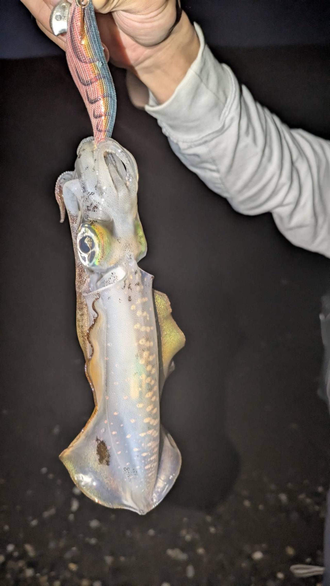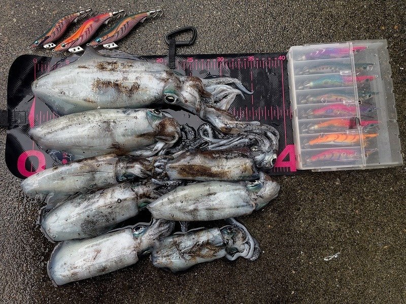 ようやく海の状況と休みが合うタイミングとなり久しぶりのエギングへ行って来ました。秋のエギングシーズンも10月へ突入しサイスに期待が持てます。夜中の上げ潮止まりまでを時合と予想しエントリー。エギはエギ王K3号シャローでスタートし潮の具合を探ります。すると開始早々に友人が1杯キャッチ。自分も3投目で1杯目を釣るも締める際にオートリリース(汗)からの5投目で2敗目キャッチ。潮は程良く流れているので更に沖を狙うべくエギ王K3.5号シャローへチェンジしそこから3杯連発でキャッチ。明らかに3号より反応が良くバラシも5杯程有りました。隣で釣っていた友人にもパターンとエギサイズを伝えると即ヒット。この日最大の胴長20㎝でした。このまま続くかと思いきや月が隠れてしまい同時に潮が緩くなり失速。そこで新製品のサーチシャロー3号へチェンジするとこの日最小サイズの胴長14cmがヒット。これを最後にアタリが途絶え終了としました。
