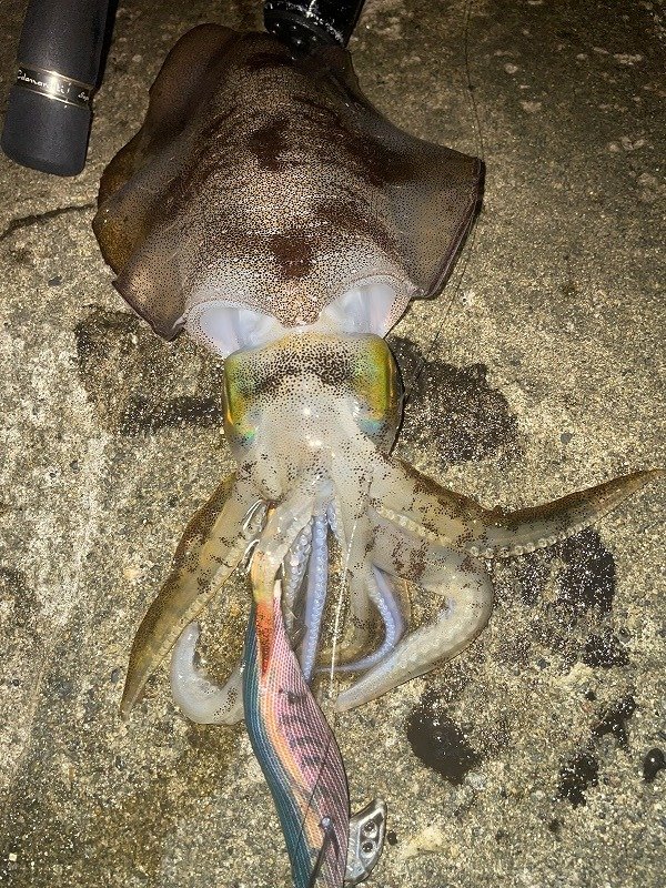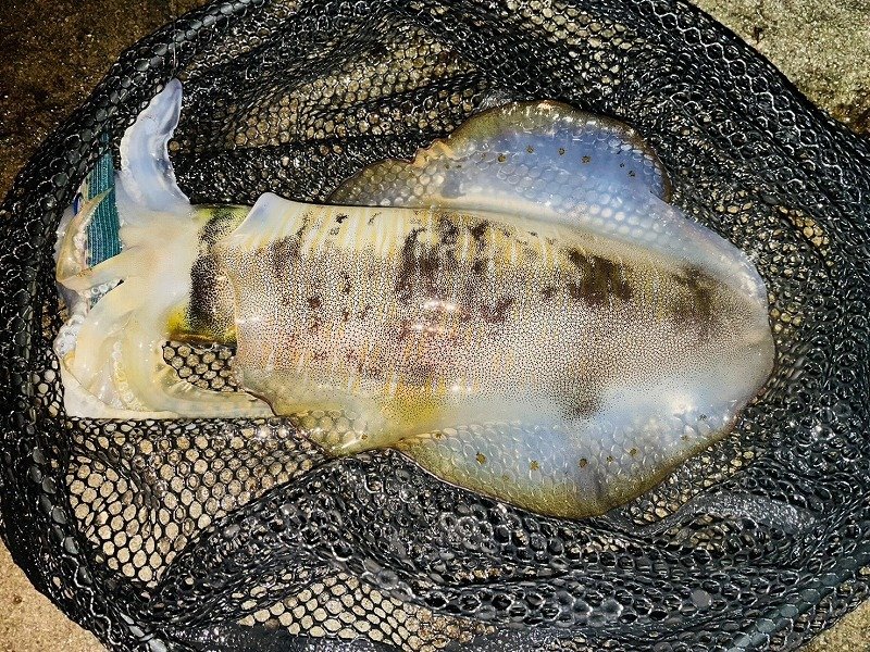 前回の釣行から日が空きましたがようやく海が落ち着いたのでナイトエギングへ行って来ました。前日の夜も釣行しましたが、思いの外荒れており濁りもきつくノーバイトでした。夜中の下げ始めを時合と予想しポイントへエントリー。先行者も居た為1等地は立てず自分なりに把握していた地形から2番手に良いとされるコースへアプローチ。エギ王K3号スーパーシャローを選びキャスト。風も相まって緩い潮ですが流れておりイイ感じです。荒れた後と言う事を考慮してボトムに付けづ・離さずといった具合をキープ。すると1杯目をキャッチ。胴長20㎝の良型です。さらにコースを絞りキープキャストすると待望の2杯目。この秋自身最大の胴長25㎝でした。時合だったのか立て続けに3杯目胴長19㎝をキャッチするも続かず明け方まで粘ると4杯目の胴長11cmをキャッチし終了としました。まだまだタイミングが合えば良型アオリイカが狙えますので是非釣行してみて下さい。