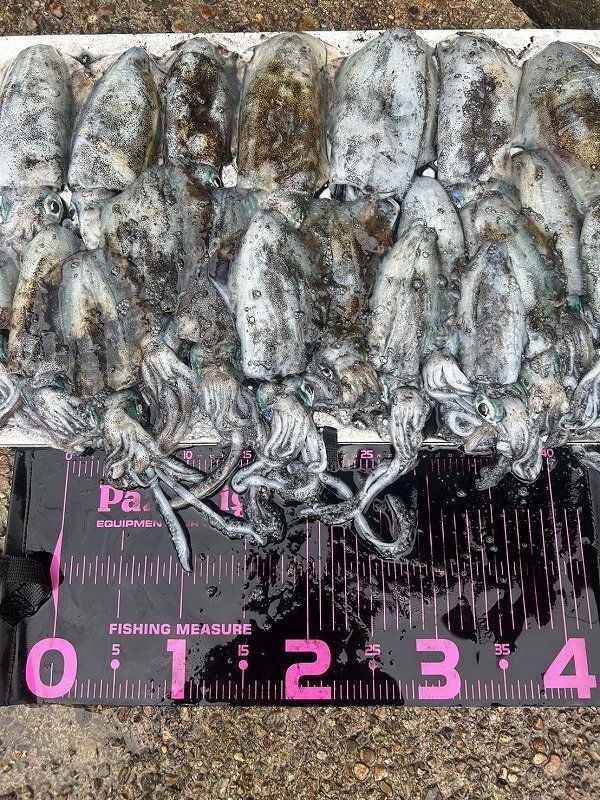 いよいよ待ちに待った10月の満月大潮!が連日思うような状況とはいかず釣りが出来ない荒れ模様・・・それでもなんとか可能性に掛けて釣行してみました。ポイントへ着くと釣り人ゼロ。波は少しウネリがあるものの問題ありません。ここ最近のエース「エギ王K3.5号シャロー」で遠投するとイイ感じに潮が効いています。流れの中でステイを長くしドリフト。早速1杯目をキャッチ。合流した友人達に状況を伝えそれぞれキャスト。潮の効いている角度・レンジ・ヒットパターンをお互いにシェアし順調に数を伸ばしていきます。時折胴長20㎝オーバーも混じり引きを堪能♪月は出ていませんが大潮ならではの潮流を味方に釣りまくります。手前でのヒットは無く遠投した先の潮で乗る事がほとんどでした。最終的には6人トータル56杯と十分な釣果で終了しました。