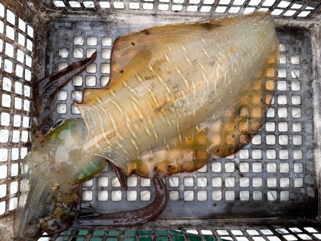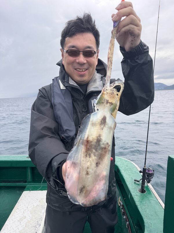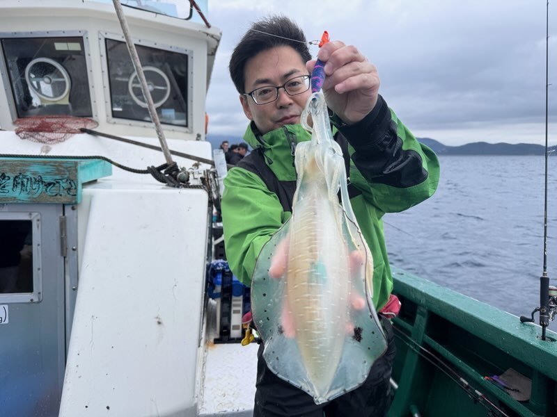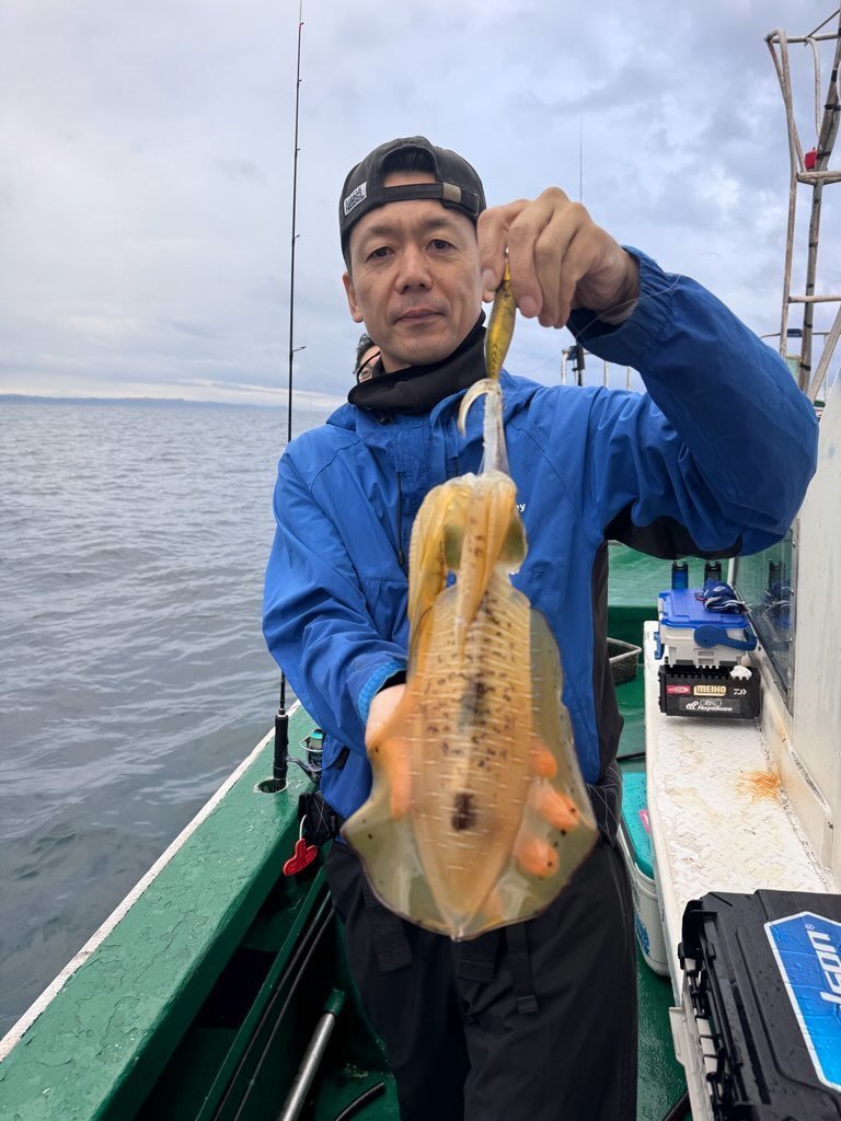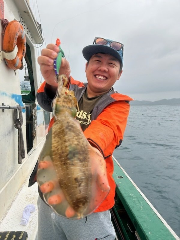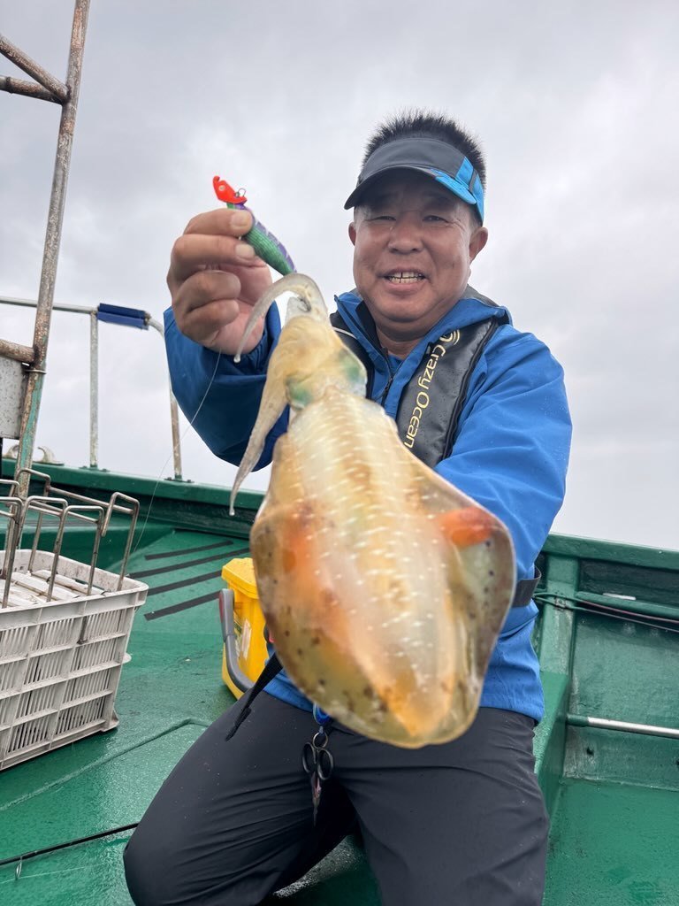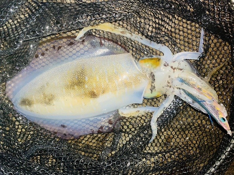 いい塩梅の風が吹いておりその後はコンスタントにアタリが出始めお客様が1kgの良型をキャッチ。良いな~と思いつつアタリに集中しているとヒット!まずまずの引きで楽しみながらリールを巻いていると何と別のアオリイカが一杯追ってくるではないですか!しかもデカい・・掛かっているイカを抜き上げてまだ見えているイカの近くにエギを投げ沈めてアクション&フォール!頼むから抱いて!祈りが通じて無事ヒットし、タモで大事に掬って貰いキャッチしました。タモから出す時に大量のスミを吐かれましたが船長が計測してくれた所0.98kg・・スミを吐かれる前だったら1kgあったのではと気絶寸前です。同じ様な追っかけイカがその後皆に見られ面白かったです!私の最終結果は6杯でほとんど胴長20cm以上で楽しめました!まだもう少し行けそうです。お早目の釣行がおススメです!