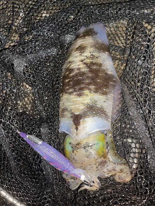 前回の釣果を期待して2夜連続釣行です。が、予想通り波が徐々に強くなる予報なので既にウネリがあります。しかし濁りは入っておらず月明かりがしっかり出ている為僅かな希望に期待しながらキャスト。前日と違い表層での勝負は厳しいのでボトム付近に狙いを定めエギ王K3号でネチネチ誘うと待望の1杯目。胴長20㎝ジャストの良型です。そこから少しウネリが落ち着きを見せた為3号スーパーシャローへチェンジ。アタリが無い時間が続きますが粘っているとようやく2杯目をキャッチ・その30分後に同じようなサイズを1杯追加。ここでウネリが強く出始め危険と判断し終了しました。
