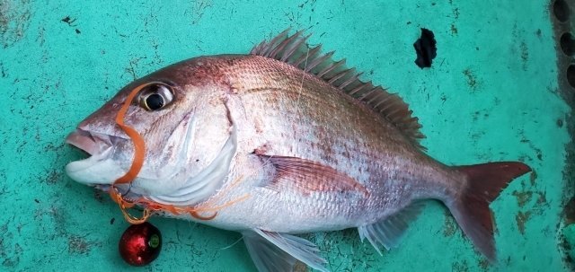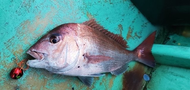 魚探の反応を探してポイントを移動していると、良さそうな反応が見つかったのでジグを落とすとすぐにアタリがあり、船中全員ヒットのお祭り騒ぎ!しかし上がってきたのは全て良型のマダイ(笑)