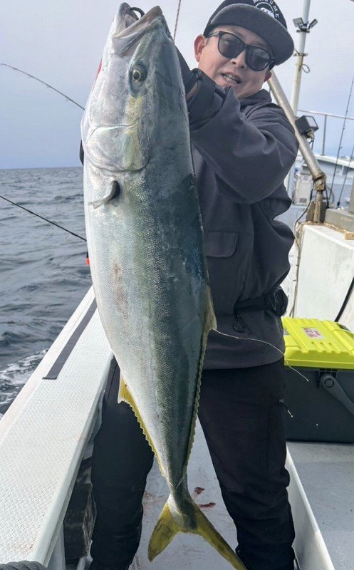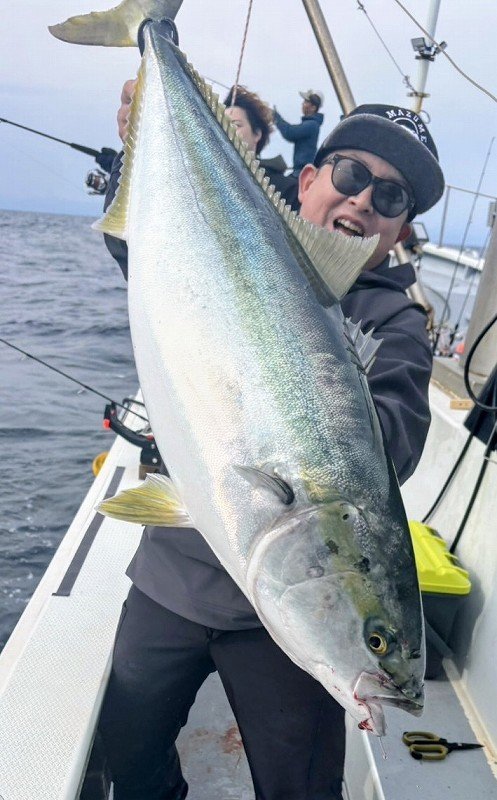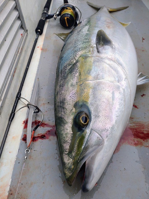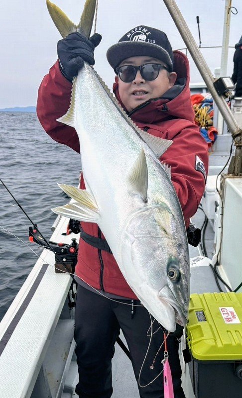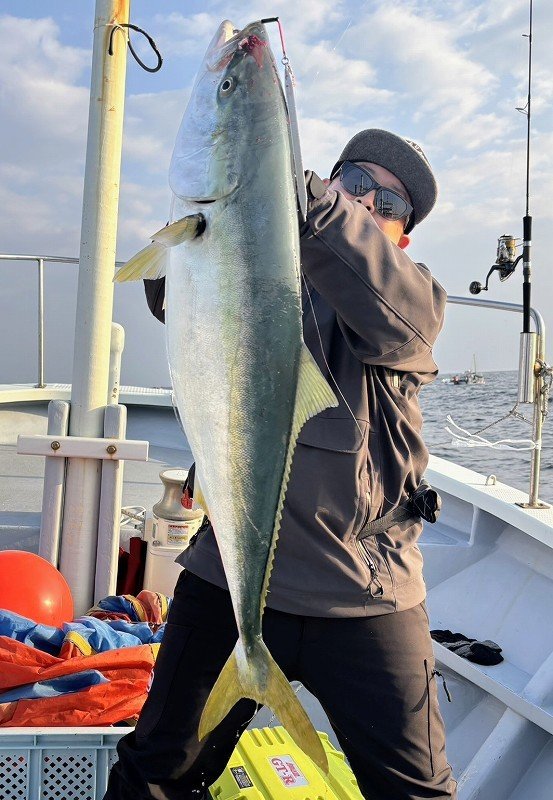 を探りますが群れが抜けたのか釣れるサイズはイナワラばかり…。気が付くと11時を過ぎており、何もないまま終了も頭を過りましたが…雲が厚くなり風が吹き始め船の流速が少し上がったかなというタイミングで払い潮の流しで待望のヒット!!フッキングしても動かない!?重量感からして絶対デカい!!ラインが勢い良く引き出されドラグ音が最高に心地良かったですね!この瞬間がたまりません!浮いてきた魚体は寒ブリと呼ぶにふさわしい丸い魚体で船上計測9.6kgでした。惜しくもブリサイズには届きませんでしたが十分過ぎるサイズでした。食べるのが楽しみですね!最後までシャクり続けたことと流速や角度に合わせたジグの選択が良かったのかもしれません。詳しくは店頭で。まだまだ続くブリシーズンを思い切り楽しみましょう!スタッフ:跡邊