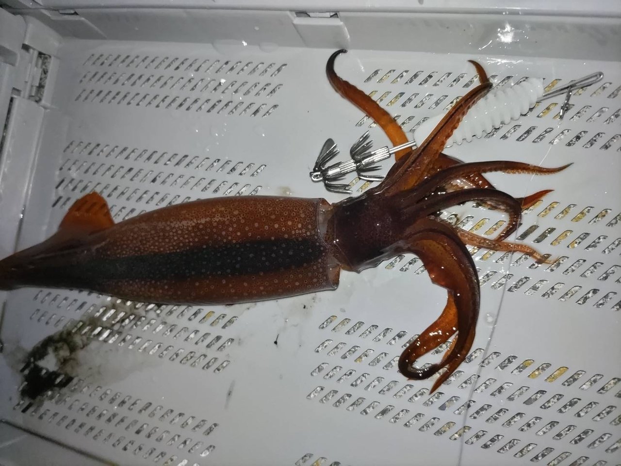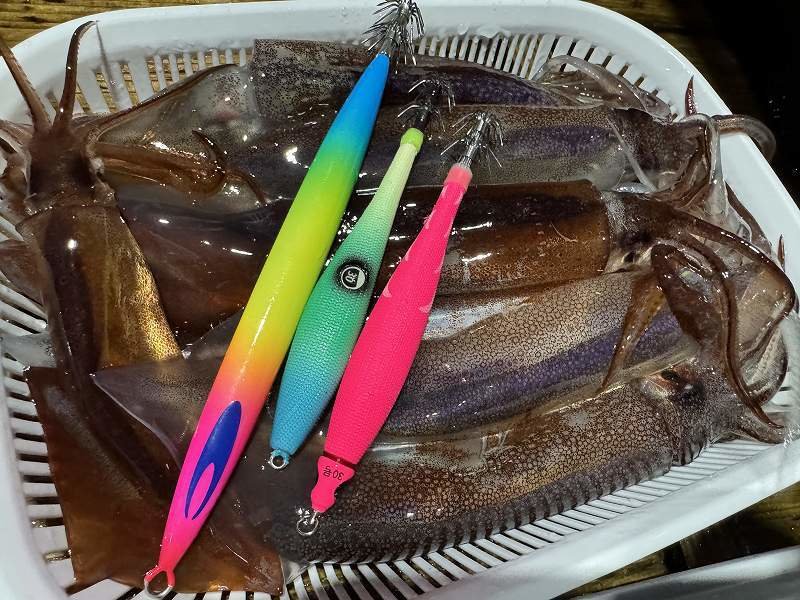 まだまだ釣れそうな感じのスルメイカ。イカジグと早潮対策に40号50号(150-180g)クラスのウエイトも準備して挑んでください
