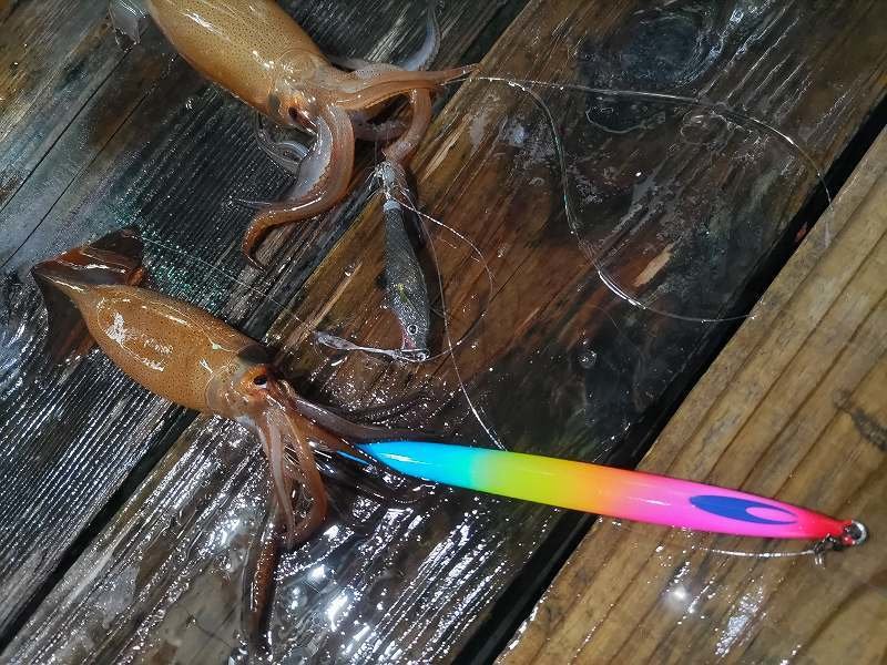 サバ被害も少なく、アピール強いハデなカラーのイカジグが高反応。シルエットのデカイ、ハイブリッドもけっこう釣れました!レンジが深い時間は黒いスイスイスティックもかなり良かったですよ!