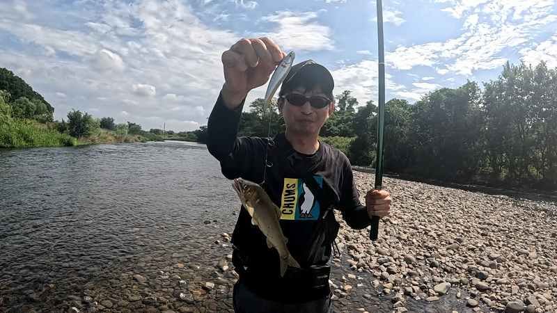 足利市内の渡良瀬川で延べ竿アユルアー釣り、今回の釣行は小山駅南店の安藤さんと2人での釣りとなりました。ポイントは水深が足首から膝上程の水深の早瀬と腰上ほどのトロ瀬。早瀬はエスケードバイブ100Sのタイプ1とタイプ2をスポットの流速と水深にあわせて使い分け、トロ瀬はミノータイプのエスケード100MDFを使いました。やはり結果が早くでるのは早瀬のポイントでやる気のある鮎がいれば結果が早くついてきます。早瀬のポイントが落ち着いたらトロ瀬をじっくり攻めるのが効果的でした。