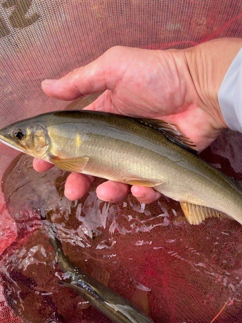さて、下流のメジャースポットに移動、先行者3人でしたが午後3時を過ぎたこともあって1人は帰り、2人のみ。スペースはあるのでとりあえず少し水深のある平瀬からスタート。しかしなかなか反応貰えず。小さな波の変化のあるところで粘っていると目印が勢いよく上流へ!慌てて竿を上に絞りましたがどうやら間に合わずダンゴになってしまいバレ。再び反応が途絶えます。少しずつ下がりながら探っていくと前触れも無くアタリ、今度は獲れましたがサイズは21~22㎝といったところ。再び同じところで泳がせてみましたが反応無さそうなので下がろうと思って竿を立てたところでガツーン!ラッキーパンチ炸裂!やたらと引きまくるのでデカイのかと思いきや1尾目と同サイズ、なーんだと気を抜いたところで痛恨のキャッチミス><いや、風のせいか!……。