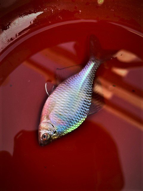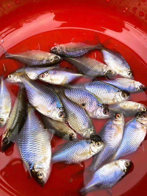 見えるサイズが小さいので、針をたなご用の小さいものに変え、エサのグルテンも小さめにつけるとようやく小さな1匹が。おそらくカワムツと思われます。その後も仕掛けを沖目に振り込みカーブフォールしきったところでシモリにアタリが出るのを合わせると釣果が出るようになってきました。小物ながらも1時間ほど熱い釣りを楽しみ納竿しました。