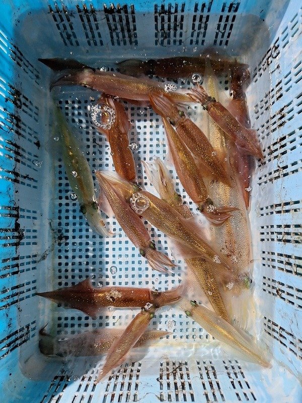 ここ最近の釣果としては、1人0杯~30杯(ヤリイカ)といった状況で、サイズは小さいのがメインで、たまに胴長30㎝程の大型が混じるような感じ。