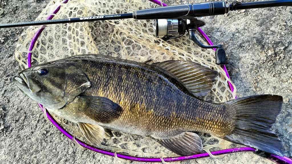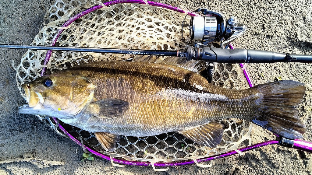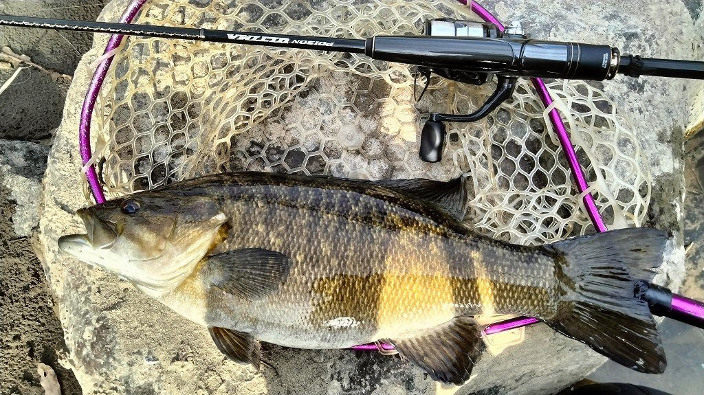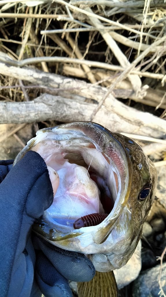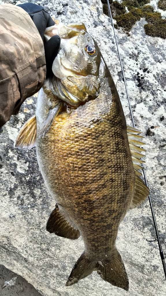 昼から行ってきました。ドロップショットミノーのダウンショットで開始早々40UPがヒットしますが後1メートルのところでバラシ……。その後は1時間ほど反応がなく、最初の場所に戻ると再びバイトが。しかし1秒だけのってフックオフ……。大きくポイントを移動し、ライブインパクト2.5のダウンショットでゴロタを丁寧に攻めていると足元でバイトが。ようやく47cmが釣れました。その後カバースキャット3インチに変えると3回バイトがあり、4回目でようやくノせられて40cmが釣れました。その後ドロップショットミノーで38cmを釣りましたが、他は反応がなく帰宅です。かなり食いが浅く、渋くなってきました。