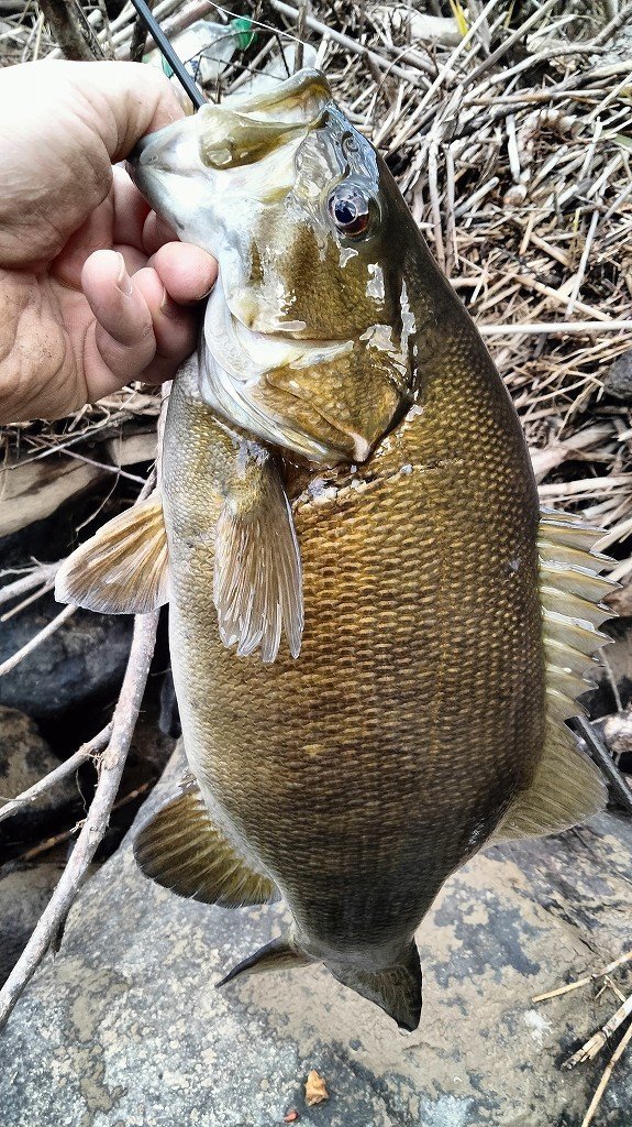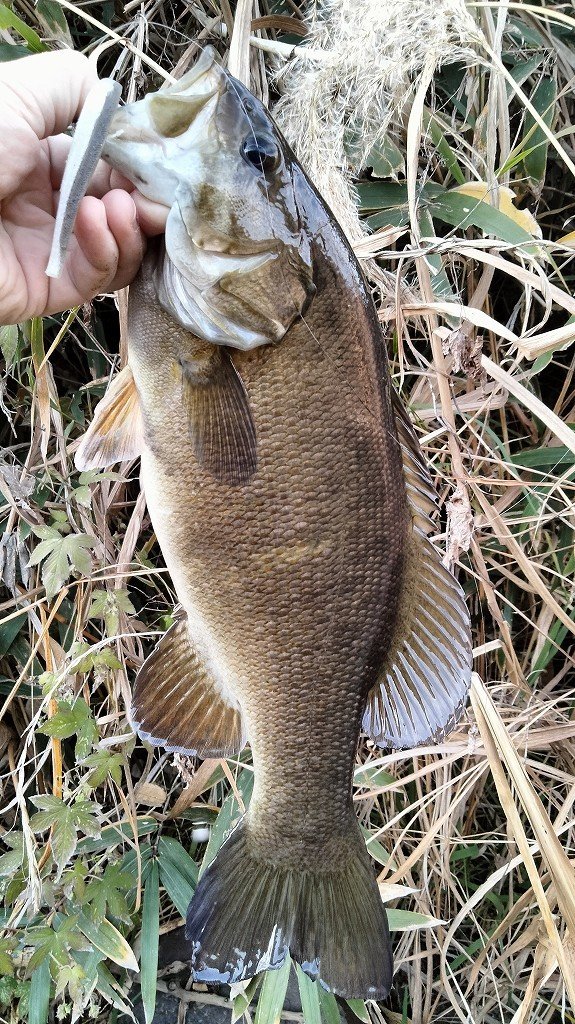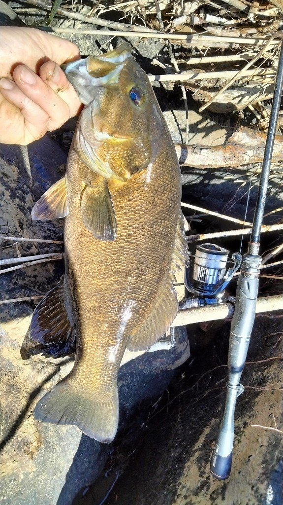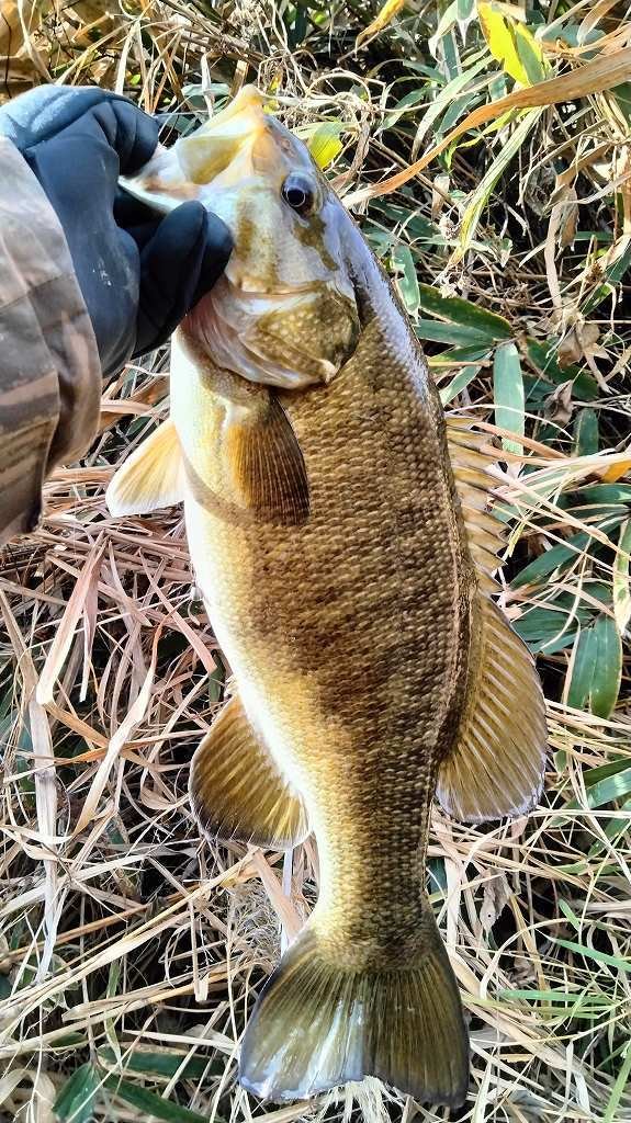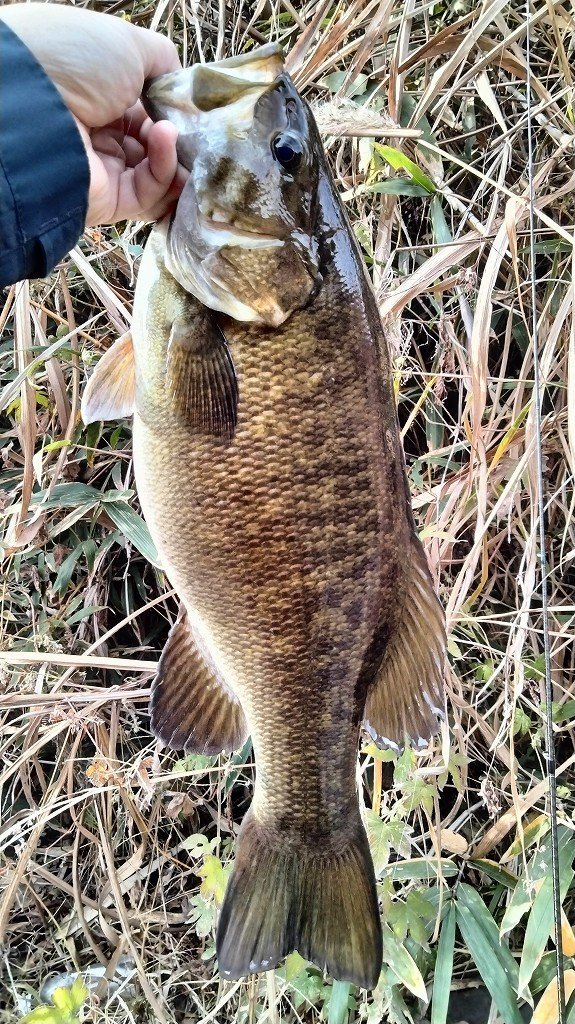 大晦日釣行です。ポイント到着後、緩い流れのゴロタを攻めますが反応無し。流れのある深場に狙いを変え、ライブインパクトのダウンショットで丁寧に誘っているとバイトが。かなりの引きで50近いバスでしたがフックオフ…。別のポイントに移動し、シャローのゴロタ場を攻めていると違和感が。慎重にやりとりして51cmを釣りました。その後は風が強くなり反応もないので帰宅です。