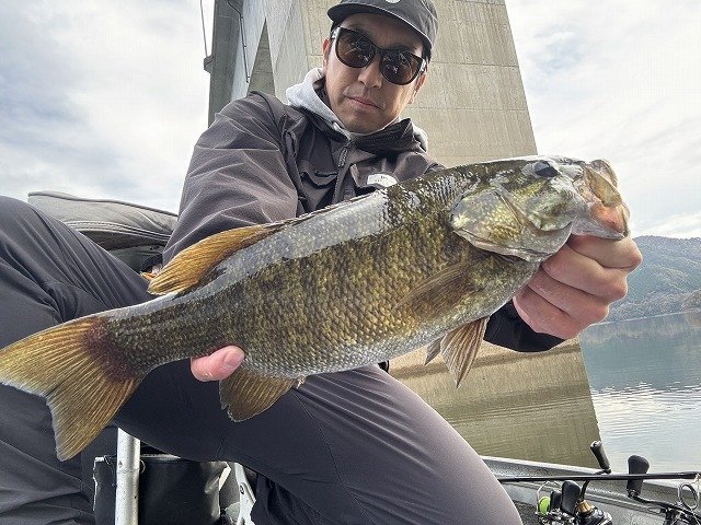 真野ダム中央の橋下の岬周辺。午前中1本[44cm]午後1本[47cm]の2本。