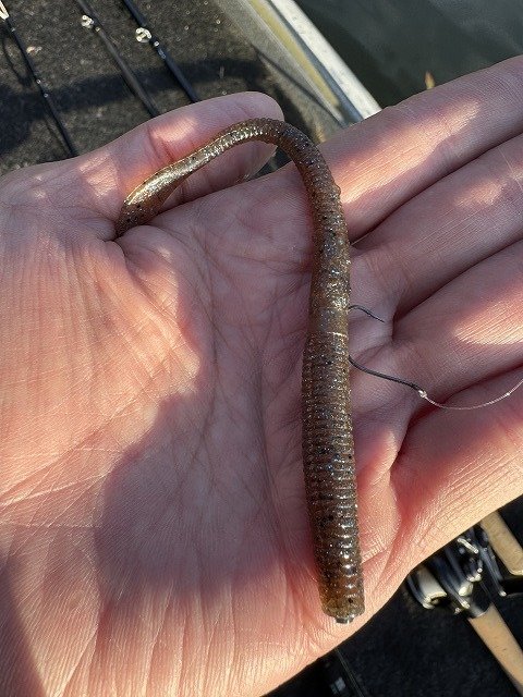 この日は、シャッドテールワーム4inchもしくは5inchを1.8gのウェイテッドフックを使用した巻きの釣りが好反応。